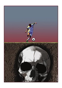کاریکاتوری که بازیکن فوتبال را در حال بازی روی جمجمه کارگر